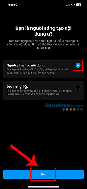Bước 4: Lựa chọn Người sáng tạo nội dung hoặc Doanh nghiệp và nhấn Tiếp.