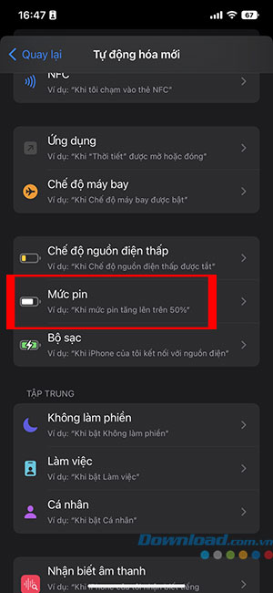 Bước 4: Cuộn xuống trong danh sách các tính năng tự động có sẵn và nhấn vào Mức pin.