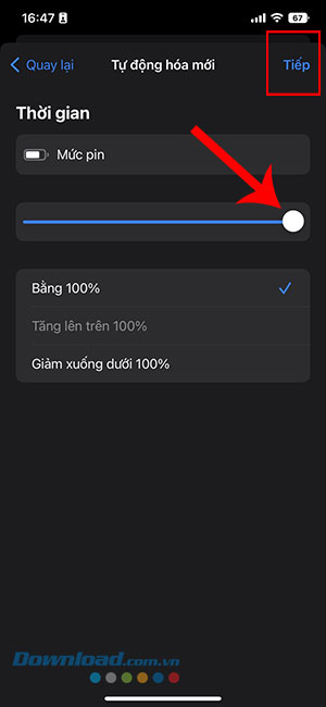 Bước 5: Kéo thanh trượt mức pin sang bên phải. Mọi người sẽ thấy Bằng 100% được viết bên dưới thanh trượt. Bây giờ, hãy nhấn vào Tiếp ở trên cùng bên phải