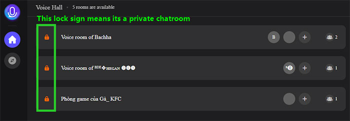 Phòng chat có đặt mật khẩu sẽ ở trạng thái không công khai (biểu tượng khóa), phòng trò chuyện không đặt mật khẩu sẽ ở trạng thái công khai (biểu tượng mở khóa).