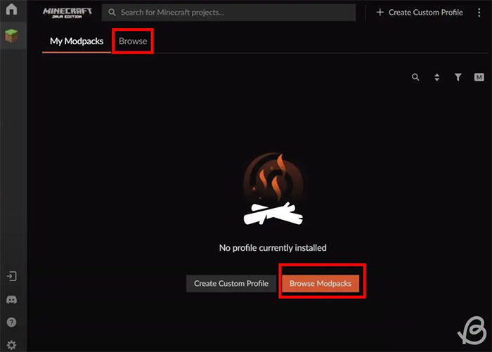 Bây giờ, mọi người có thể thêm mod và modpack bằng cách nhấp vào nút Browse Modpacks hoặc Browse ở trên cùng. Mọi người cũng có thể tạo một hồ sơ tùy chỉnh để lưu trữ mod của mình.