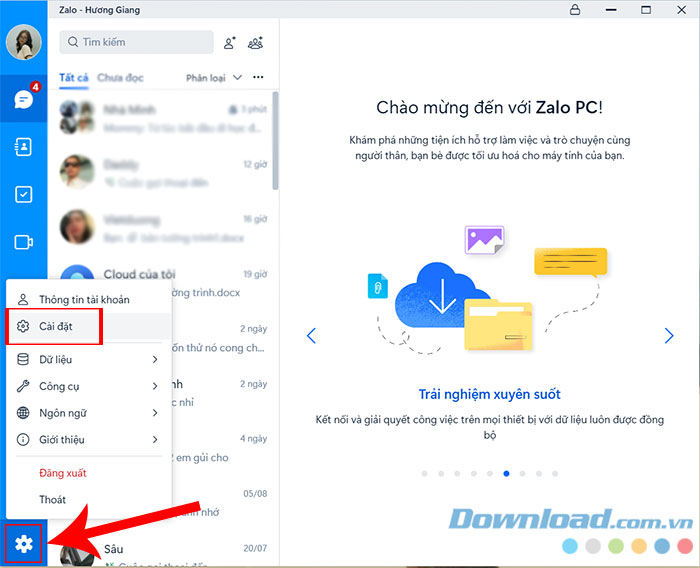 Bước 1: Mở ứng dụng Zalo trên PC và nhấn vào biểu tượng bánh răng cài đặt ở góc dưới cùng bên trái của giao diện chính. Sau đó, chọn Cài đặt trong cửa sổ pop-up vừa mở ra.