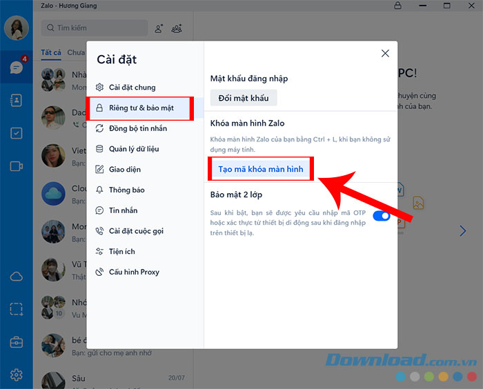 Bước 2: Trong cửa sổ Cài đặt, truy cập tab Riêng tư & bảo mật. Tại mục Khóa màn hình Zalo, ấn vào nút Tạo mã khóa màn hình để bắt đầu thiết lập mã khóa.