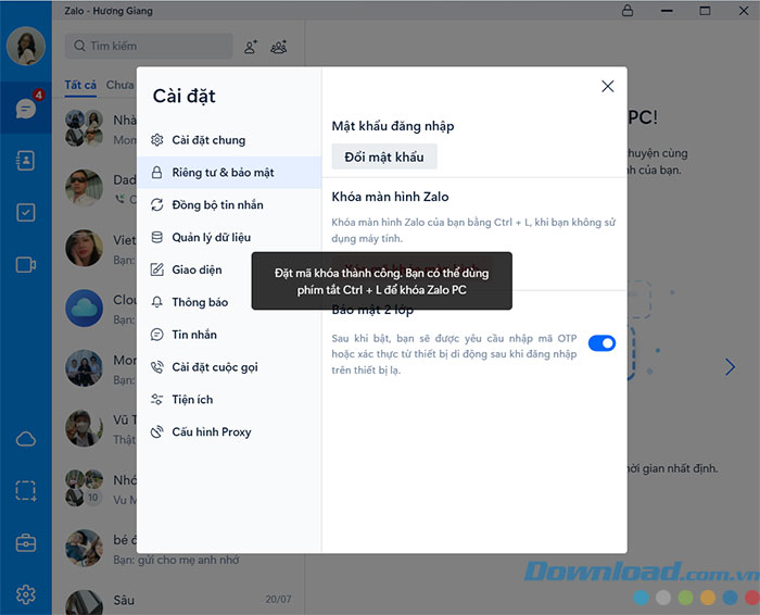 Vậy là chỉ với vài thao tác đơn giản, người dùng đã có thể khóa màn hình Zalo trên máy tính khi tạm thời không sử dụng. Bằng cách này, mọi người sẽ không cần thoát ứng dụng hoặc đăng xuất khỏi Zalo khi không sử dụng.