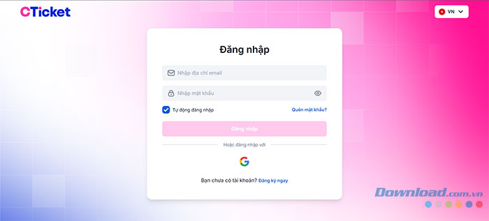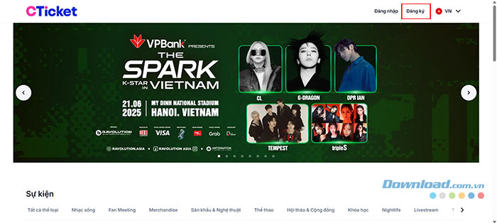 Bước 1: Truy cập trang web cticket.vn và nhấn vào Đăng ký ở góc trên cùng bên phải trang chủ.
