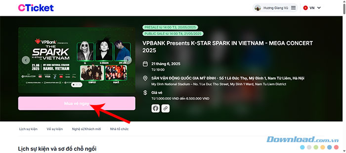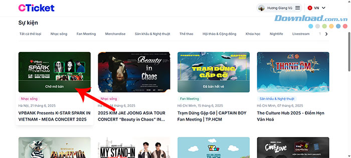 Bước 1: Truy cập CTicket.vn và đăng nhập vào tài khoản của mình. Sau đó, chọn sự kiện VPBank Present K-Star Spark in Vietnam - Mega Concert 2025 từ trang chủ.