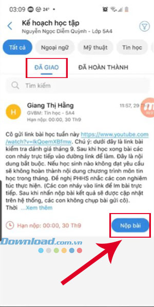 Bước 2: Chọn tab Đã giao để xem danh sách bài tập mà giáo viên giao, sau đó nhấn nút Nộp bài ở bài tập đã hoàn thành và muốn nộp.