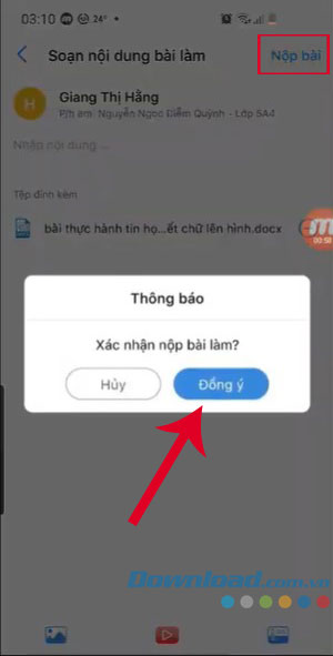 Bước 5: Sau khi chọn tệp hoặc hoàn tất nhập nội dung bài làm, hãy nhấn nút Nộp bài ở góc trên cùng bên phải. Cuối cùng, nhấn nút Đồng ý để xác nhận nộp bài trong cửa sổ thông báo.