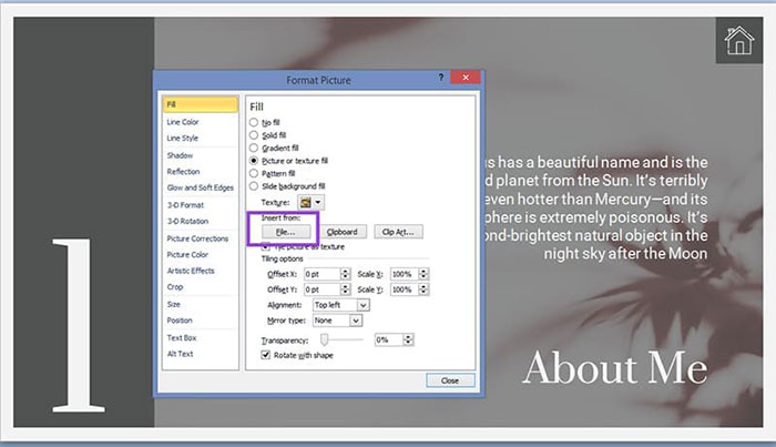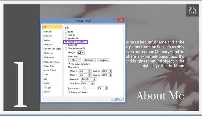 Bước 5: Trong tab Fill, hãy đánh dấu vào ô bên cạnh Picture or texture fill.