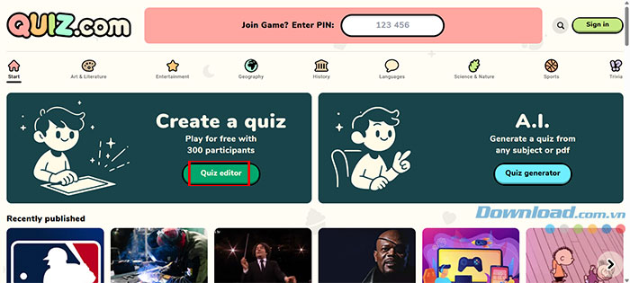 Bước 2: Sau khi đăng nhập, hãy nhấp vào Quiz editor ở phần Create a quiz trên trang chủ.