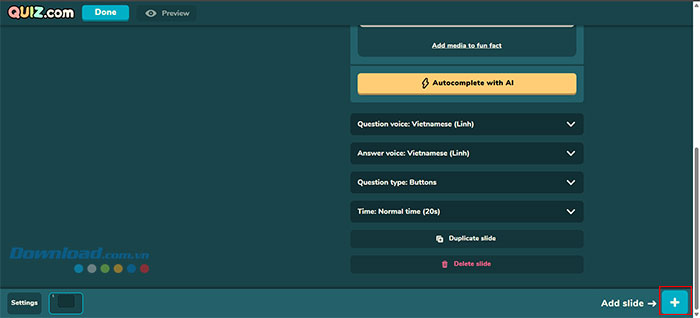 Bước 6: Sau khi hoàn thiện một slide câu hỏi, nhấn vào dấu cộng để chuyển sang tạo slide mới.
