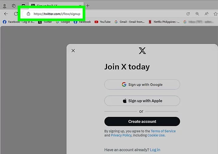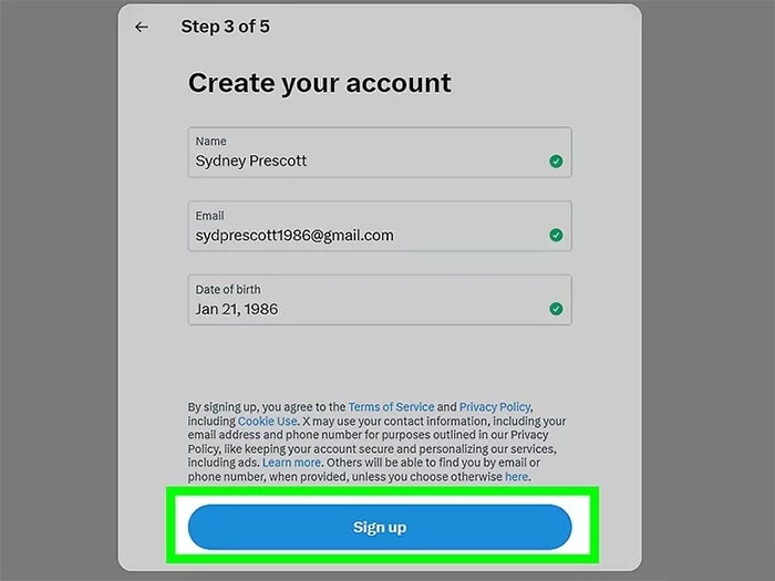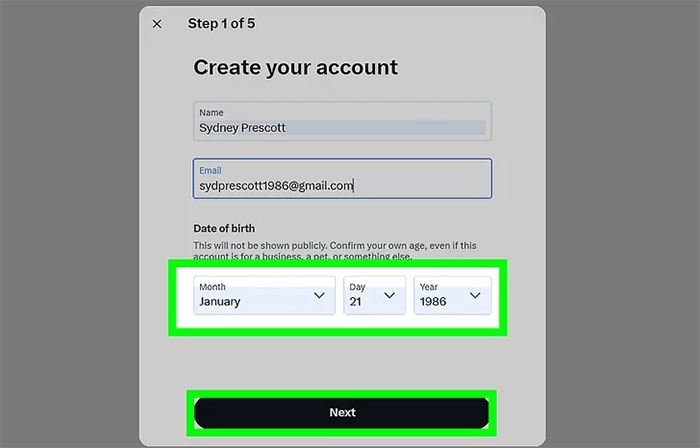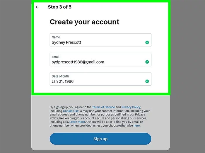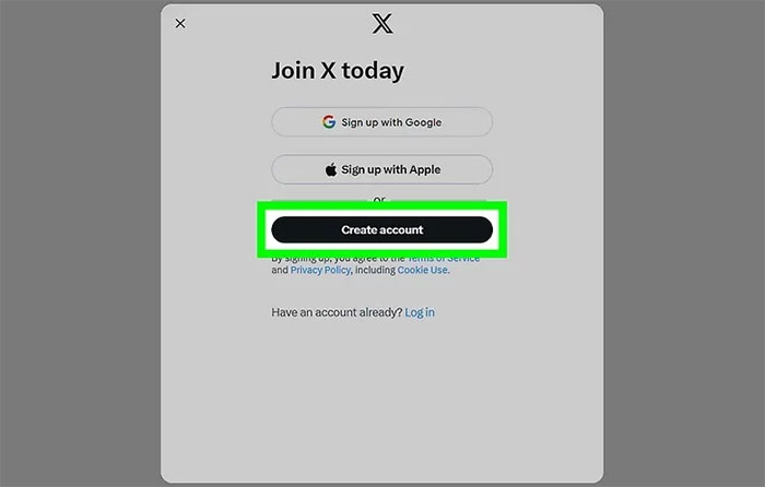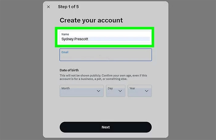 Hãy truy cập X.com/signup trên trình duyệt web. Nhập tên, số điện thoại hoặc email, và ngày sinh để bắt đầu. Trên ứng dụng di động, nhấn Create account, sau đó nhập tên, số điện thoại/email và ngày sinh để tiếp tục.
