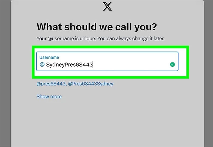 Bước 12: X sẽ tự động tạo một tên người dùng dựa trên thông tin của bạn. Mọi người có thể nhập username mong muốn và nhấn Next, hoặc nhấp Skip for now để dùng tên được tạo sẵn.