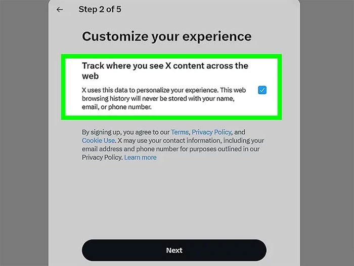 Bước 6: Chọn hoặc bỏ chọn việc cho phép theo dõi người dùng, rồi nhấp Next. X sử dụng dữ liệu này để cá nhân hóa trải nghiệm của bạn.