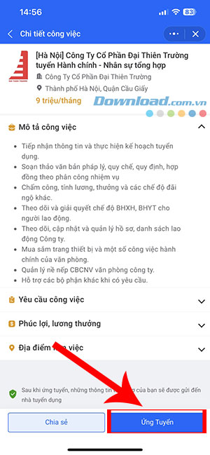 Bước 4: Sau khi đã thấy công việc phù hợp, hãy chạm vào để đến trang mô tả Chi tiết công việc. Nếu ưng ý với công việc đó, nhấn nút Ứng tuyển.