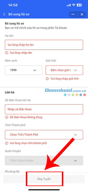Bước 5: Hoàn thiện các thông tin được yêu cầu để Bổ sung hồ sơ cá nhân của mình. Cuối cùng, nhấn nút Ứng tuyển để nộp hồ sơ xin việc.