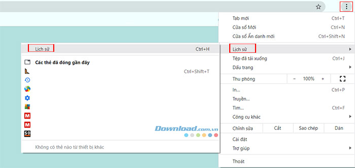 Bước 2: Sau đó mở Google Chrome và nhấp vào ba dấu chấm ở góc bên phải, điều hướng đến History, tiếp tục chọn History.