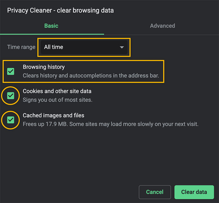 Bước 4: Chọn mọi thứ muốn xóa (lịch sử duyệt web, cookie, bộ nhớ cache) và chọn khung thời gian từ trình đơn thả xuống. Sau đó nhấp vào Clear data.