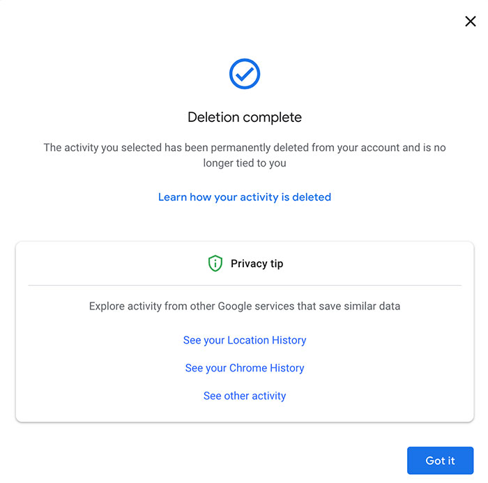 Bước 6: Tiếp tục nhấp vào Xóa để xác nhận muốn xóa lịch sử của mình. Màn hình tiếp theo sẽ xác nhận rằng mọi người đã xóa lịch sử tìm kiếm, đồng thời cung cấp các tùy chọn bổ sung để quản lý hoạt động và lịch sử.