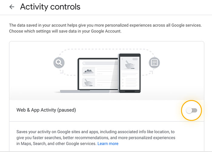 Tiếp tục tắt nút chuyển đổi cho Hoạt động web và ứng dụng (để nó chuyển sang màu xám) nhằm ngăn Google lưu lịch sử tìm kiếm.
