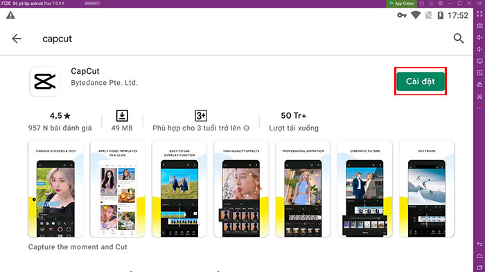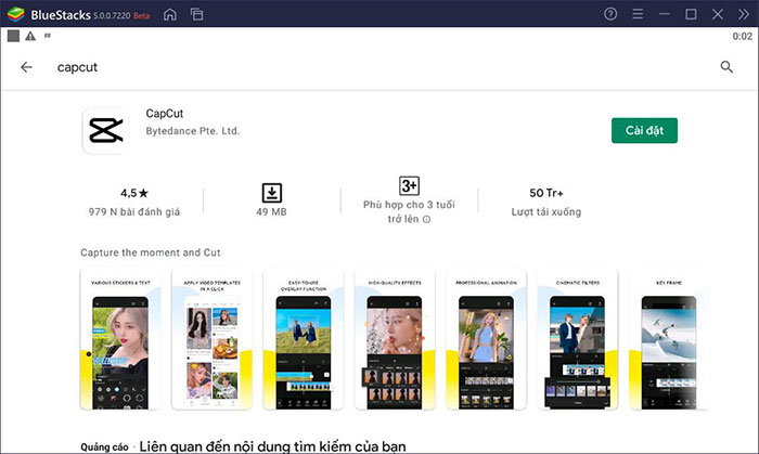Ứng dụng CapCut sẽ xuất hiện trong Bluestacks, hãy nhấn vào Cài đặt và CapCut sẽ bắt đầu cài đặt trên PC. Sau khi cài đặt, mọi người có thể sử dụng ứng dụng theo các bước sau.