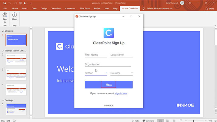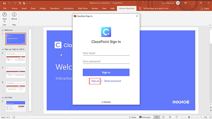 Sau bước cài đặt thì gần như ClassPoint đã sẵn sàng để sử dụng. Bước cuối cùng là tạo tài khoản. Điều này có thể được thực hiện bằng cách bấm vào nút Sign In trong tab ClassPoint.