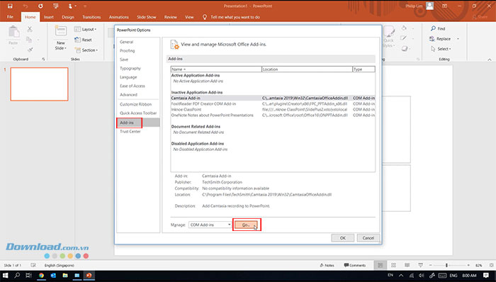Nếu không thấy tab ClassPoint trong PowerPoint, hãy chuyển đến File > Options > Add-Ins. Trong Add-Ins, mọi người có thể thấy Inactive Application Add-Ins.