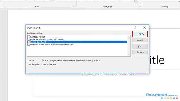 Tại đây, hãy tìm Inknoe ClassPoint và tích vào ô vuông và nhấn OK. Giờ đây tab ClassPoint sẽ xuất hiện ở đầu màn hình.