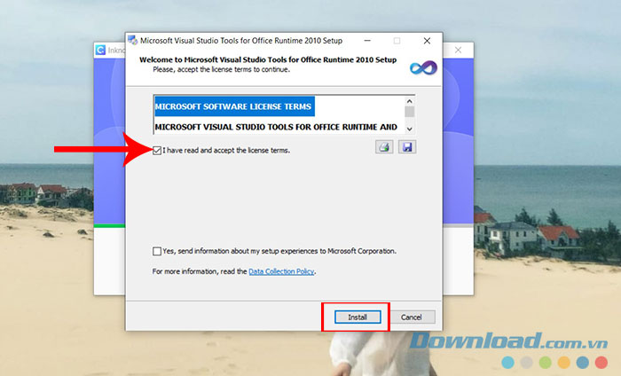 Bước 4: Tích vào ô vuông để chấp nhận điều khoản, điều kiện của Microsoft Visual Studio Tools và nhấn Install