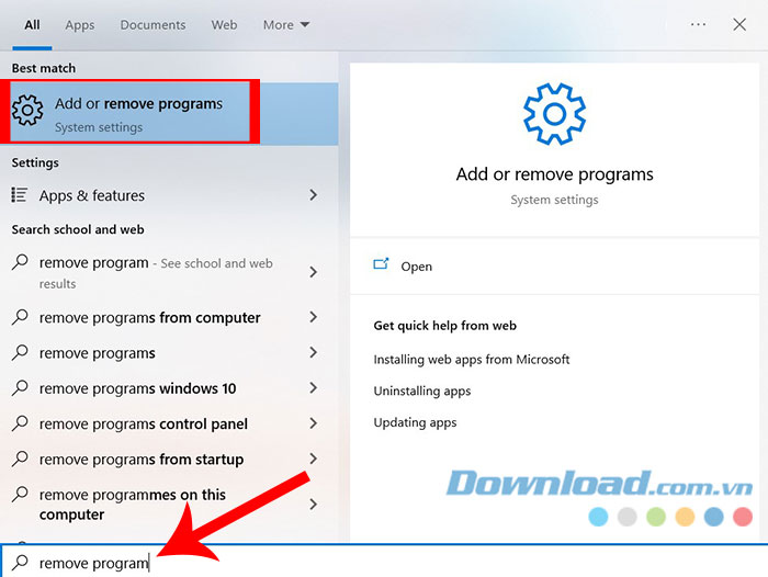 Bước 1: Gỡ ClassPoint bản cũ bằng cách nhấn phím Windows và nhập Remove programs > chọn Add or remove programs từ những kết quả được hiển thị.