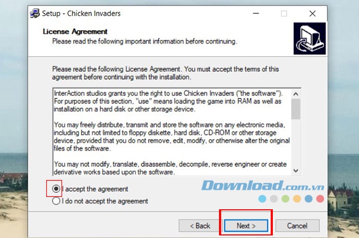 Bước 4: Click vào ô I accept the agreement và nhấn Next để chấp nhận điều khoản và điều kiện.