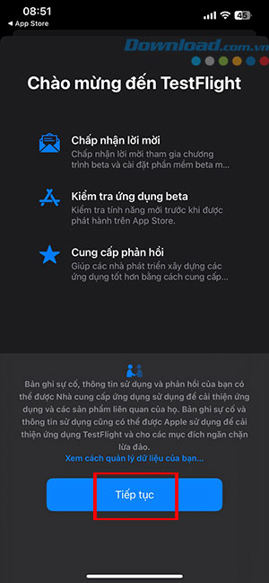 Mở App Store trên iPad hoặc iPhone và nhập TestFlight vào thanh tìm kiếm và tải xuống ứng dụng. Sau khi hoàn tất tải xuống, mở TestFlight cho iOS và chấp nhận điều kiện, điều khoản của ứng dụng.