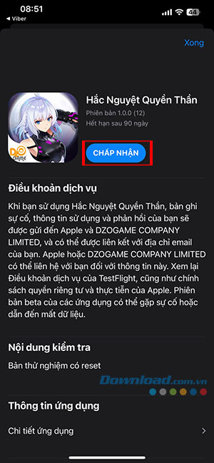 Nhấp vào liên kết mời chơi Hắc Nguyệt Quyền Thần CBT cho iOS để được điều hướng đến trang Hắc Nguyệt Quyền Thần CBT trên TestFlight. Sau đó, nhấn Chấp nhận để tham gia chương trình beta.