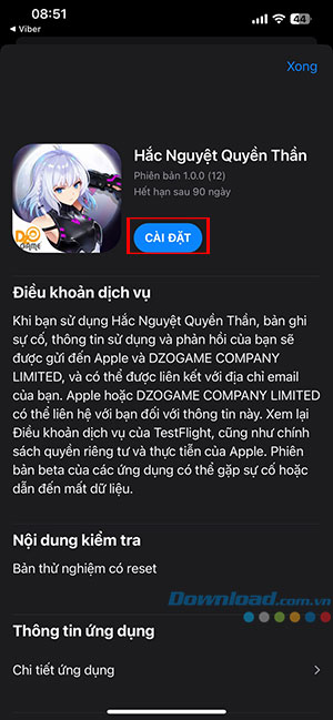 TestFlight sẽ bắt đầu tải xuống và cài đặt ứng dụng Hắc Nguyệt Quyền Thần CBT trên thiết bị. Sau khi cài đặt hoàn tất, người dùng có thể mở ứng dụng beta giống như bất kỳ ứng dụng nào khác trên thiết bị của mình.