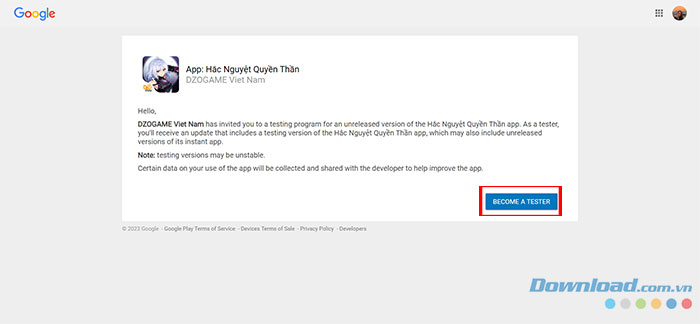 Bước 1: Truy cập liên kết mời Hắc Nguyệt Quyền Thần CBT cho Android và nhấn Become a Tester.