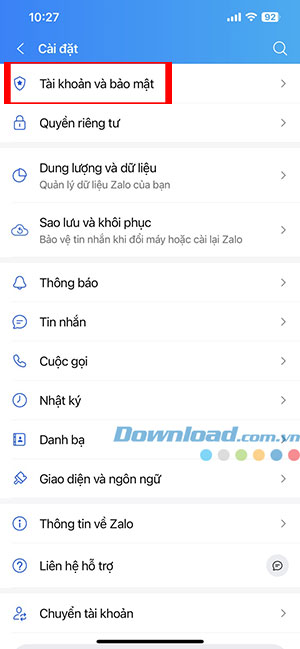 Bước 3: Trong phần cài đặt của ứng dụng, chạm vào mục Tài khoản và bảo mật.