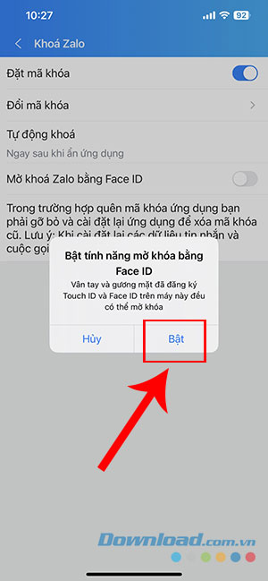 Bước 5: Chạm vào công tắc để bật Mở khóa Zalo bằng Face ID. Cuối cùng nhấn Bật để xác nhận bật tính năng mở khóa bằng Face ID.