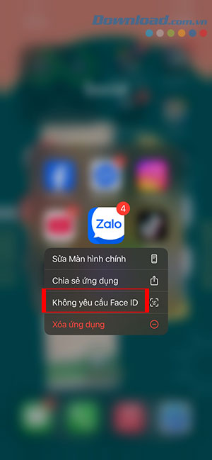 Để mở khóa lại Zalo, chỉ cần nhấn giữ biểu tượng ứng dụng và chọn Không yêu cầu Face ID. Miễn là mọi người đã bật bảo vệ thiết bị bị đánh cắp, việc bật và tắt khóa yêu cầu quét Face ID, do đó, không thể tắt mà không có sự cho phép của người dùng.
