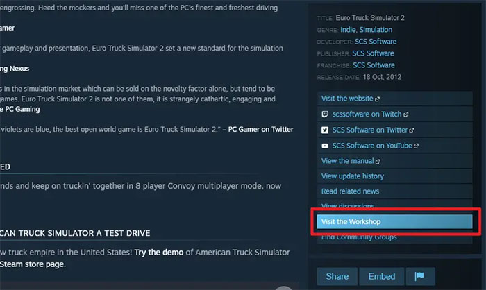 Bước 1: Truy cập trang cửa hàng Euro Truck Simulator 2 trên Steam (Web hoặc Client), sau đó nhấp vào Visit the Workshop.