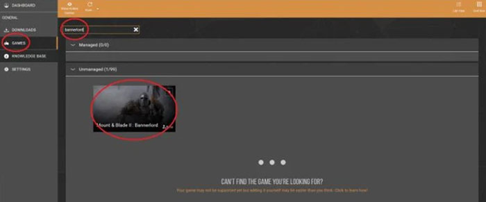 Sau đó chuyển đến tab Games (phía bên trái của công cụ), gõ Bannerlord vào thanh tìm kiếm rồi nhấp vào biểu tượng trò chơi được hiển thị. Từ giờ trở đi, Mount and Blade 2 sẽ được Vortex hỗ trợ để bắt đầu tải xuống tất cả các mod.