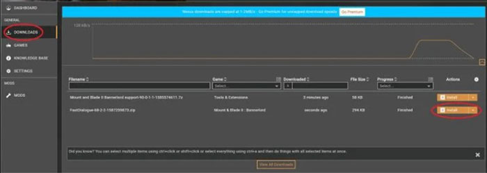 Bây giờ người chơi có thể mở công cụ Vortex và tab Download để xem tất cả các mod đã tải xuống cho Mount and Blade 2 Bannerlord. Sau đó nhấp vào nút Install cạnh mod và nó sẽ được cài đặt tự động.