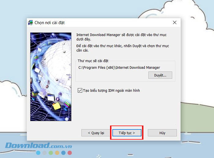 Bước 5: Lựa chọn thư mục sẽ cài đặt IDM > Tiếp tục và chờ đợi trong giây lát để phần mềm được cài đặt.