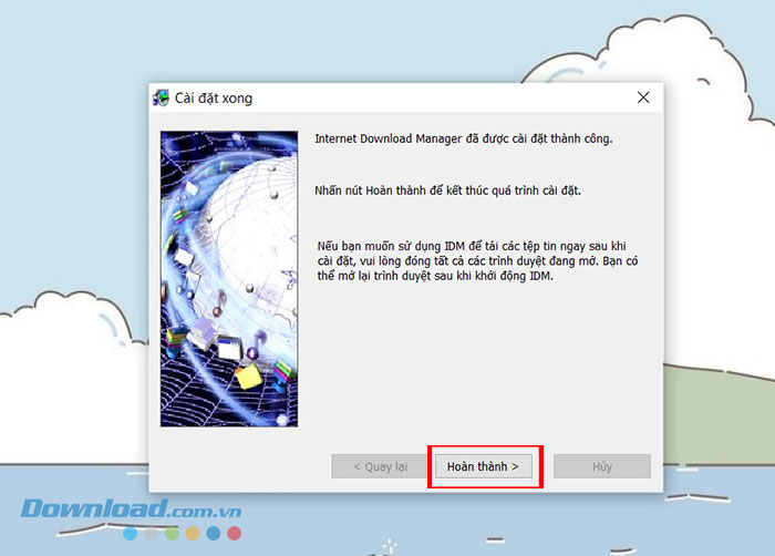 Bước 6: Nhấn vào nút Hoàn thành và quá trình tải xuống, cài đặt Internet Download Manager đã hoàn tất.
