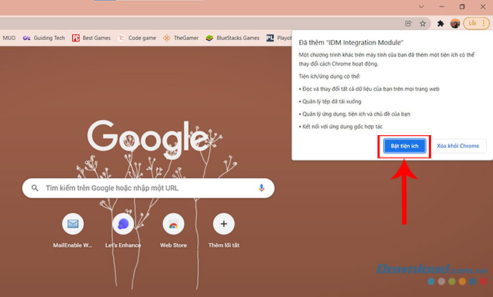 Bước 7: Mở trình duyệt web Google Chrome, nhấn vào cảnh báo ở góc trên cùng bên phải. Sau đó, chọn Bật tiện ích để tích hợp IDM vào Chrome. Mọi người có thể áp dụng thao tác tương tự trên bất kỳ trình duyệt web nào đang sử dụng.