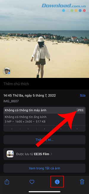 Mọi người có thể kiểm tra định dạng hình ảnh từ thư viện Ảnh. Để làm như vậy, hãy mở hình ảnh và nhấn vào biểu tượng i ở dưới cùng (hoặc vuốt từ dưới lên), thông tin về hình ảnh sẽ xuất hiện. Người dùng sẽ phải chuyển đổi định dạng hoặc sử dụng một hình ảnh khác nếu nó không ở định dạng JPEG.