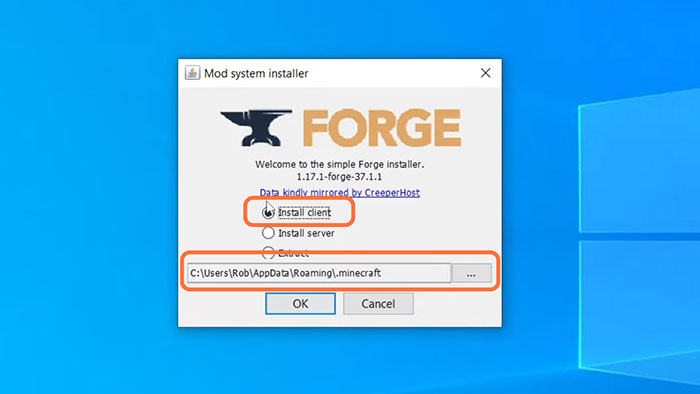 Bước 13: Quay lại và nhấn đúp để mở tệp cài đặt Forge. Khi cửa sổ pop-up xuất hiện, hãy chọn Install Client, đặt đường dẫn cài đặt và nhấp vào OK. Nó sẽ cài đặt và xây dựng tất cả các bộ xử lý, vậy nên game thủ chỉ cần đợi nó hoàn thành.