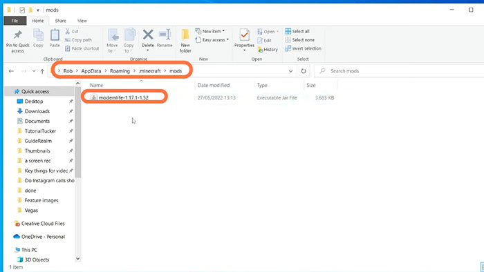Bước 15: Nó sẽ điều hướng đến nơi chứa thư mục trò chơi. Mở .minecraft > mods và kéo tệp jar Modernlife từ màn hình nền vào thư mục mod này.