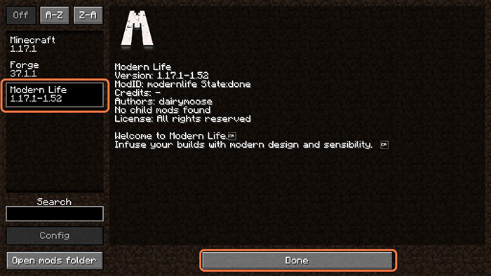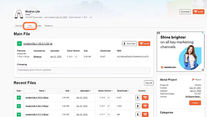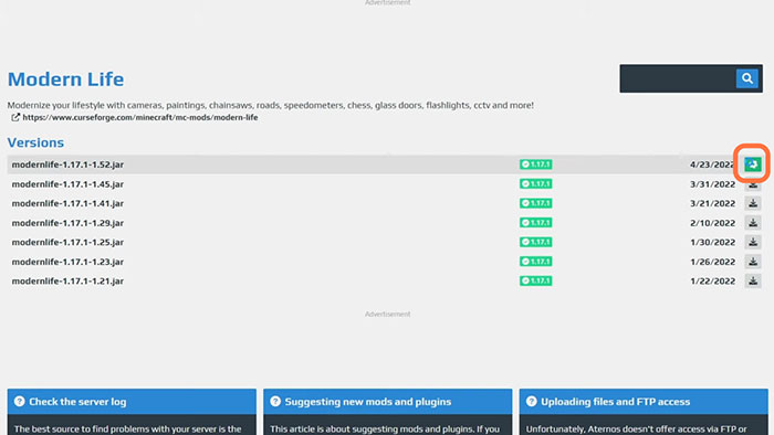 Bước 8: Ví dụ, game thủ muốn cài đặt mod Modern Life, hãy nhấp vào nó để chuyển đến trang chi tiết, nơi xuất hiện các phiên bản khác nhau của bản mod cho Minecraft 1.17.1. Mọi người cần chọn cái đầu tiên bằng cách click vào biểu tượng tải xuống và nó sẽ được thêm vào máy chủ.