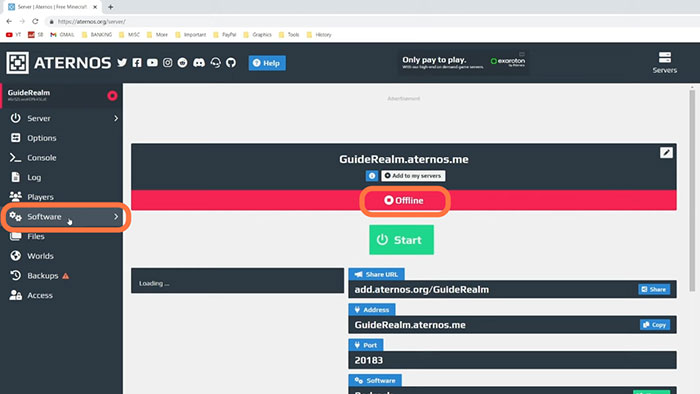 Bước 2: Máy chủ sẽ ở trạng thái ngoại tuyến, mọi người cần nhấp vào tab Software từ bảng điều khiển bên trái.