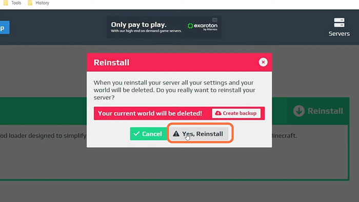 Bước 6: Một cửa sổ pop-up sẽ xuất hiện cho biết thế giới hiện tại sẽ bị xóa, hãy nhấn vào Yes, Reinstall.
